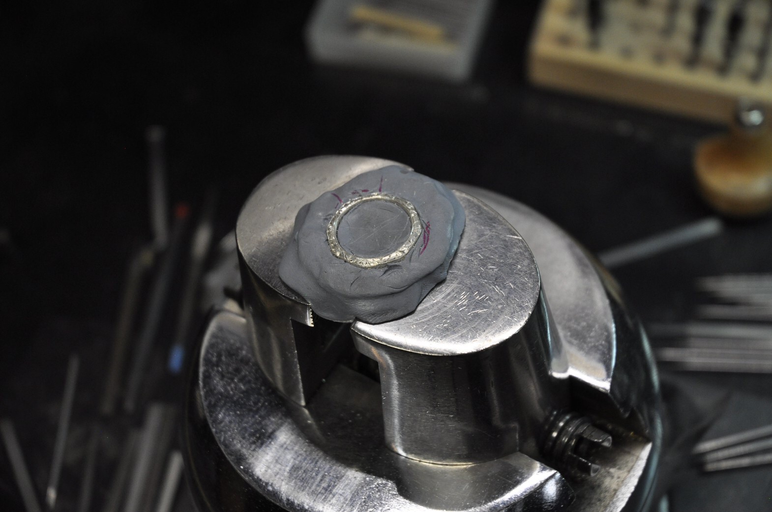 縁から0.5mmのけがき線の真ん中を彫る…彫り跡が見えなくて、最中にタガネがどこにどのくらい当たっているのかわからない。アールに均等に沿わせるのも難しい。。。